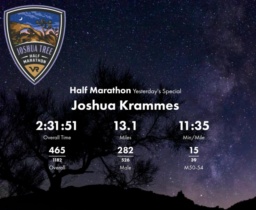 Date: Nov. 1, 2025 Participant: Joshua Krammes #1019 Race: 2025 Vacation Races | Joshua Tree Half Marathon Distance: 13.1 miles