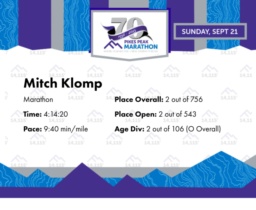 Date: Sept. 21, 2025 Participant: Mitch Klomp #147 Race: 2025 Pikes Peak Marathon Marathon Distance: 26.2 miles Weather: Nice running temperatures. A large snow/hail/rain storm in the late afternoon. Overall it was a great day for a trail run.