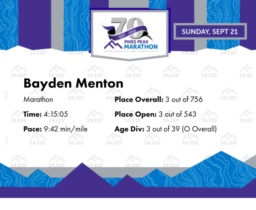 Date: Sept. 21, 2025 Participant: Bayden Menton #191 Race: 2025 Pikes Peak Marathon Marathon Distance: 26.2 miles Weather: Nice running temperatures. A large snow/hail/rain storm in the late afternoon. Overall it was a great day for a trail run.