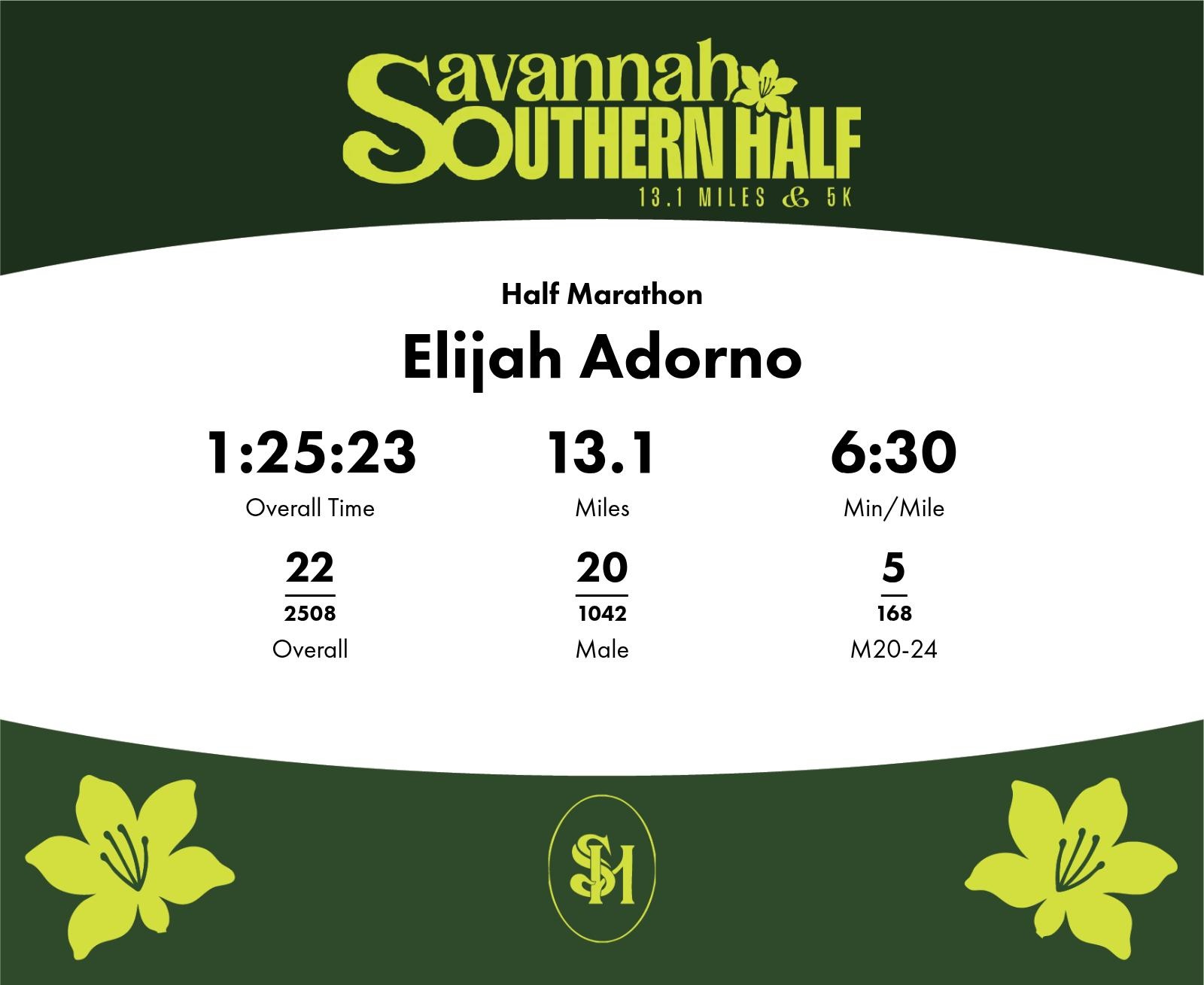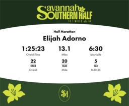 Date: November 15, 2025 Participant: Elijah Adorno #378 Race: 2025 Savannah Southern Half Marathon Distance: 13.1 miles