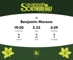 Date: November 15, 2025 Participant: Benjamin Moreno #1301 Race: 2025 Savannah Southern 5K Distance: 3.1 miles