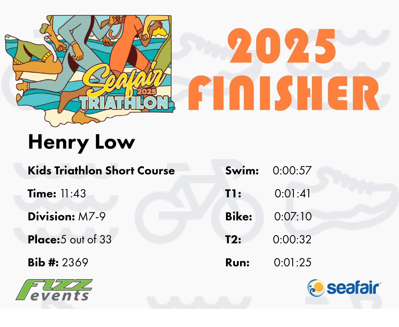 Run Finish | 2.0 | 11:43 | 5:51/miles | 1.0 | 1:25 | 1:24/miles | 13 | 9 M | 5 M7-9 |