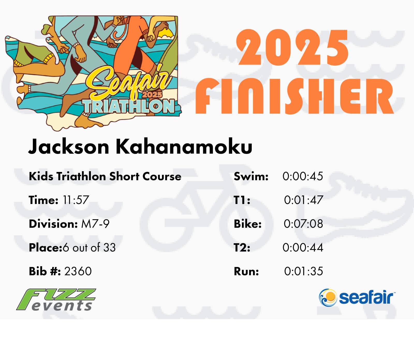 Run Finish | 2.0 | 11:57 | 5:58/miles | 1.0 | 1:35 | 1:34/miles | 14 | 10 M | 6 M7-9 |