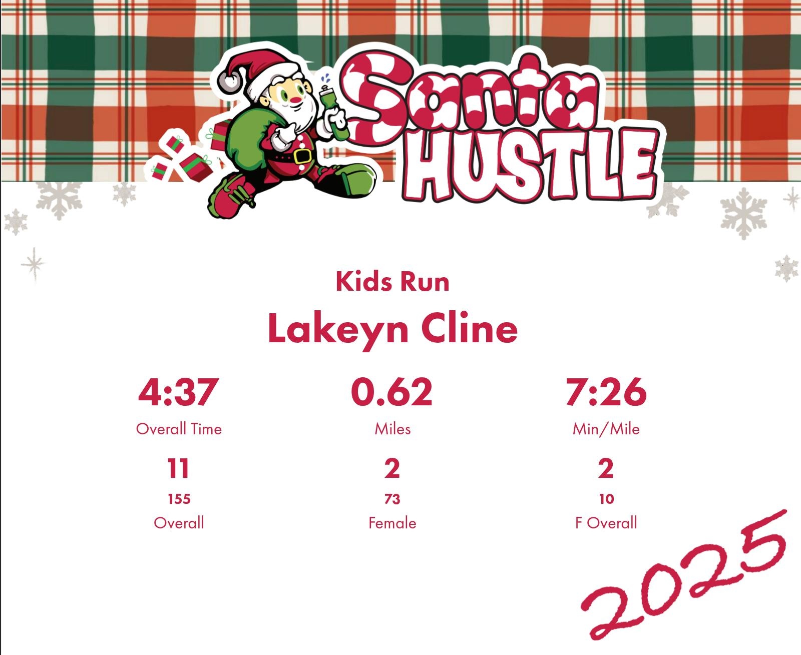 | Finish | 0.62 | 4:37 | 7:26/miles | 0.62 | 4:37 | 7:26/miles | 11 | 2 F | 2 F Overall |