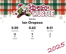 | Finish | 0.62 | 5:30 | 8:51/miles | 0.62 | 5:30 | 8:51/miles | 15 | 10 M | |