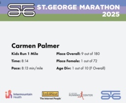 | Finish | 1.0 | 8:14 | 8:13/miles | 0.962 | 7:59 | 8:17/miles | 9 | 1 F | 1 F Overall |