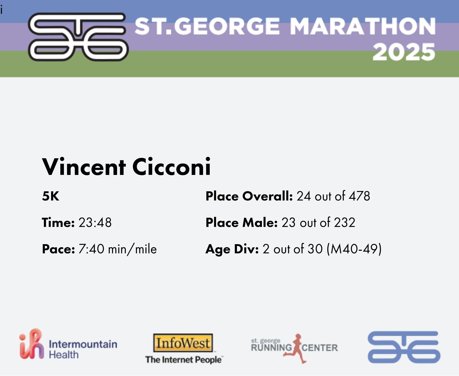 | Finish | 3.1 | 23:48 | 7:40/miles | 3.1 | 23:48 | 7:40/miles | 24 | 23 M | 2 M40-49 |