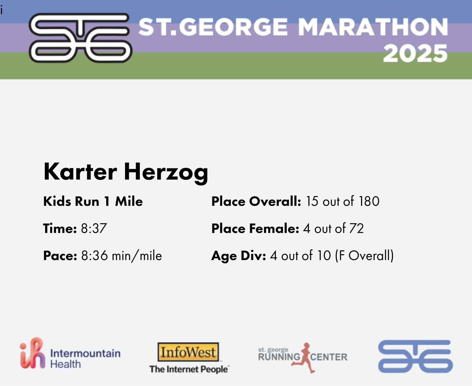 | Finish | 1.0 | 8:37 | 8:36/miles | 0.962 | 8:32 | 8:51/miles | 15 | 4 F | 4 F Overall |