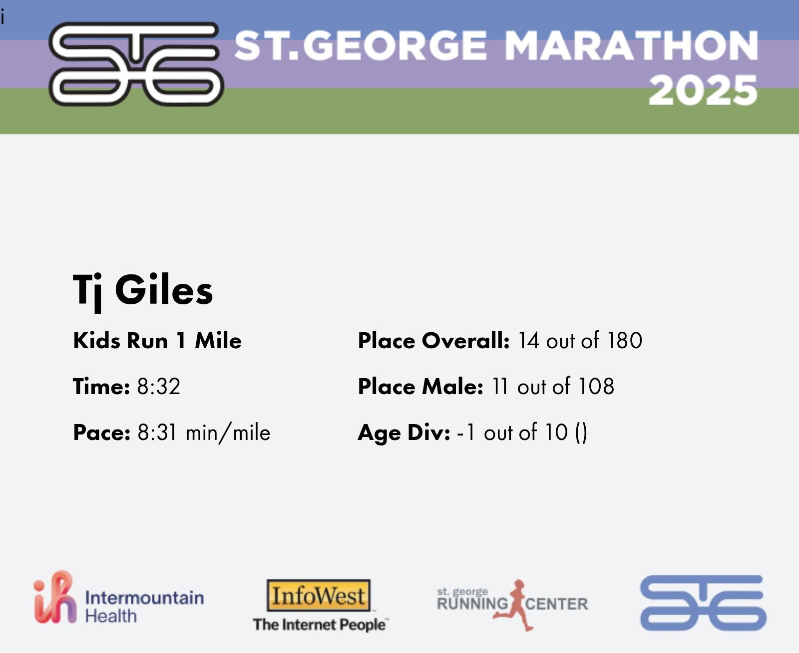 | Finish | 1.0 | 8:32 | 8:31/miles | 0.962 | 8:27 | 8:46/miles | 14 | 11 M | |
