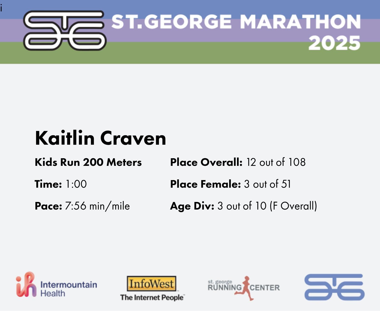 | Finish | 0.124 | 1:00 | 7:56/miles | 0.086 | 0:51 | 9:52/miles | 12 | 3 F | 3 F Overall |