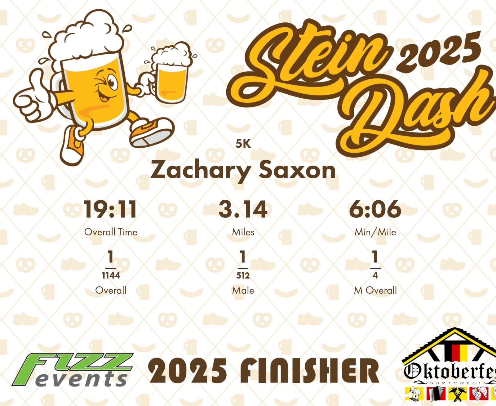 Finish | 3.14 | 19:11 | 6:06/miles | 0.93 | 6:02 | 6:28/miles | 1 | 1 M | 1 M Overall |