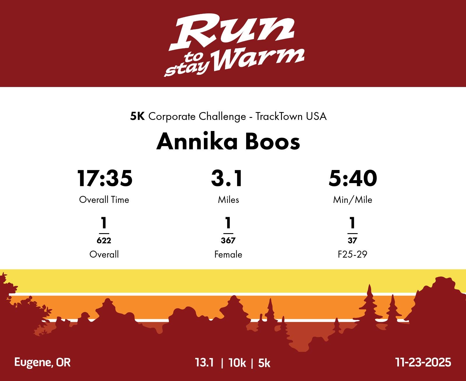 Date: November 23, 2025 Participant: Annika Boos #1113 Race: 2025 Run to Stay Warm 5K Distance: 3.1 miles