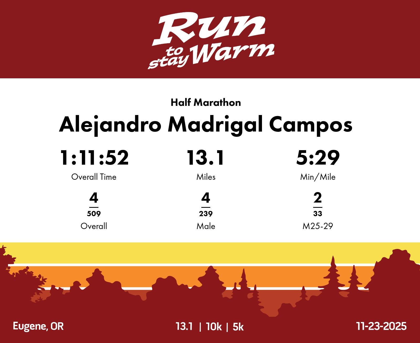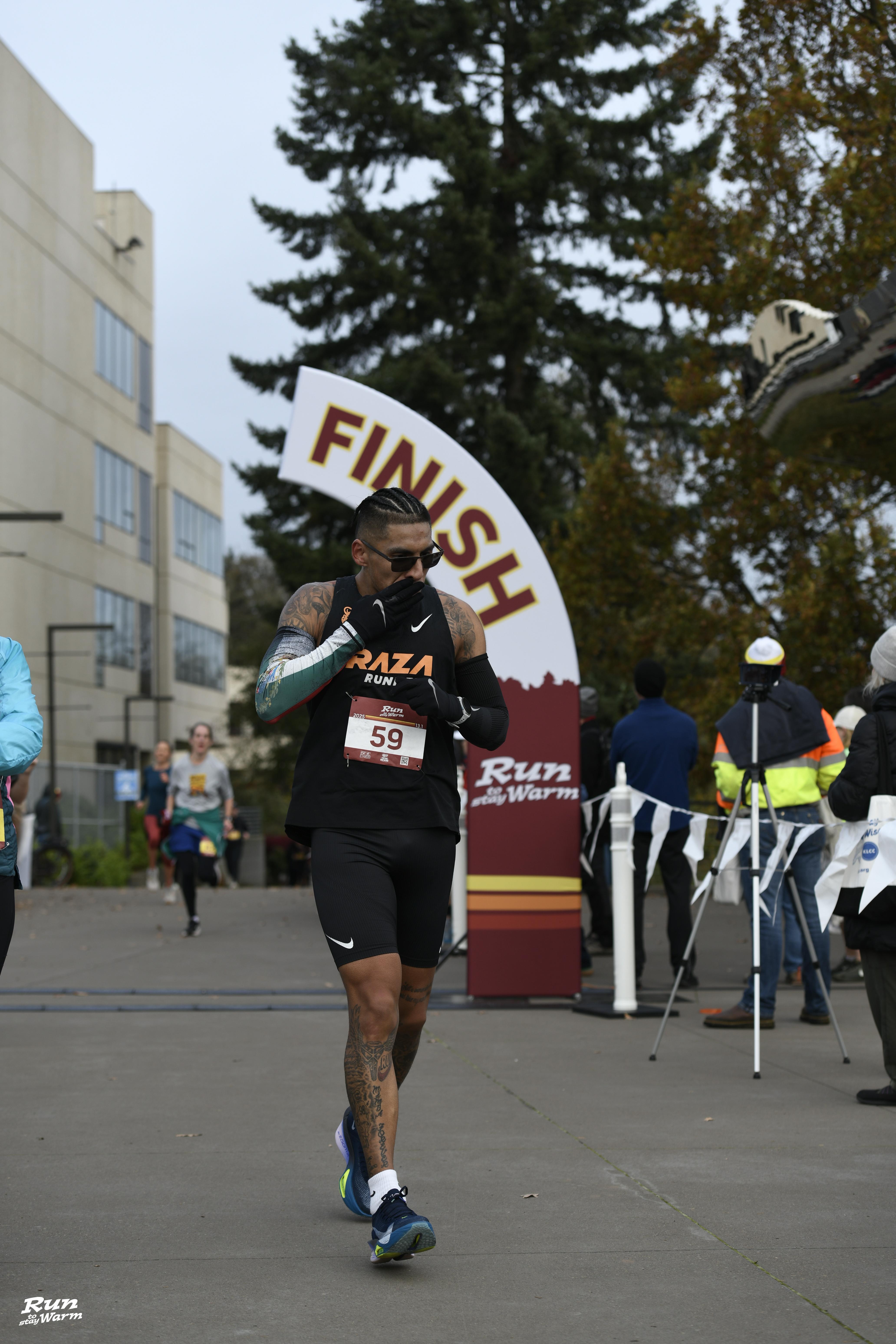 Date: November 23, 2025 Participant: Alejandro Madrigal Campos #59 Race: 2025 Run to Stay Warm Half Marathon Distance: 13.1 miles