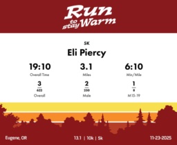 Date: November 23, 2025 Participant: Eli Piercy #1726 Race: 2025 Run to Stay Warm 5K Distance: 3.1 miles