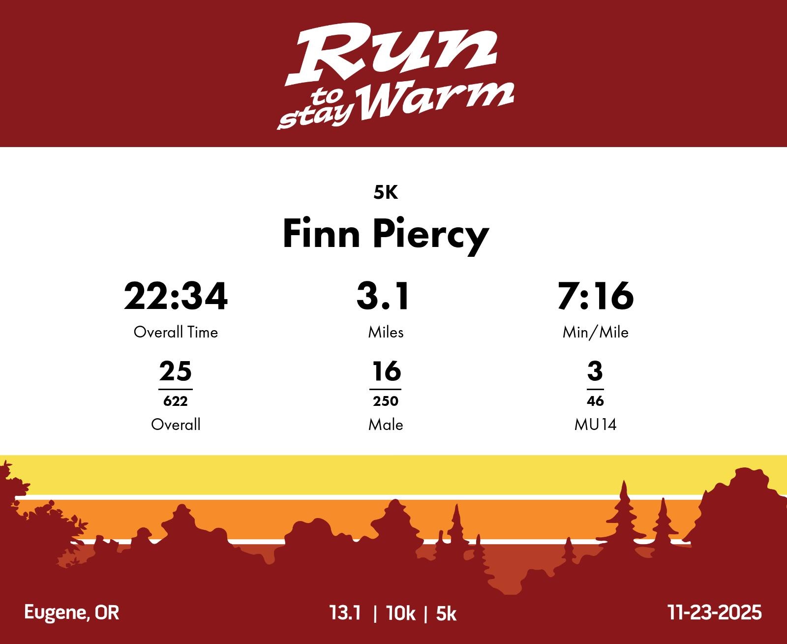 Date: November 23, 2025 Participant: Finn Piercy #1727 Race: 2025 Run to Stay Warm 5K Distance: 3.1 miles